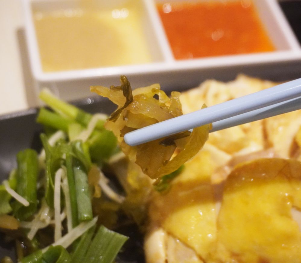 外皮黃澄澄的雞肉,帶著誘人的油脂。吃起來嫩滑好入口,加酸菜的作法很特別,除了解油膩,也增添脆脆的口感。