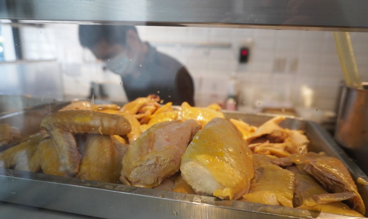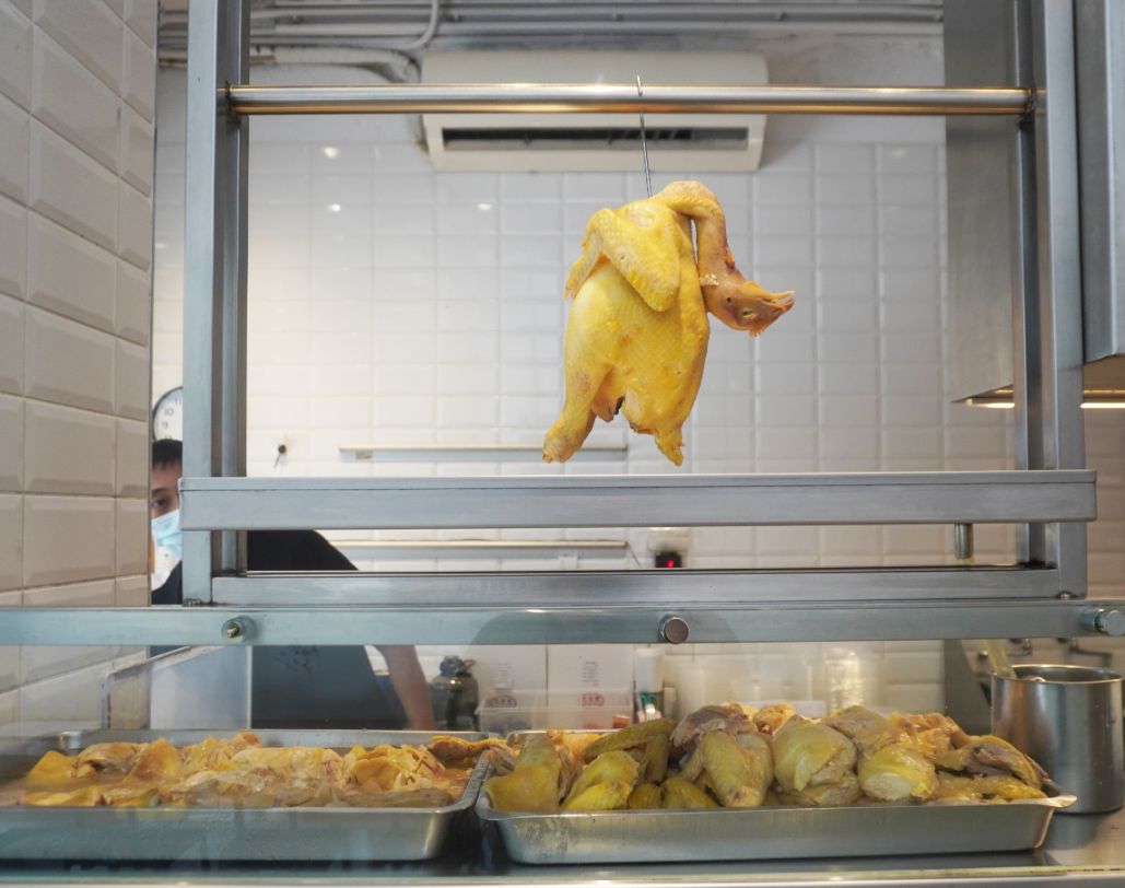 左側廚房的玻璃櫃掛上色澤金黃,帶點油脂的全雞,盤子則是切好的雞肉,看起來讓人口水直流啊。